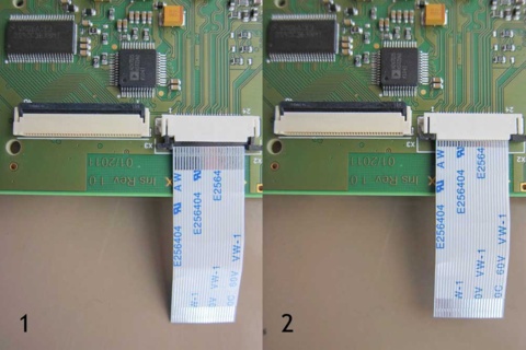 The connector X2 of Iris is the DVI-I display connector which can be used with the Colibri T20 and Colibri T30 modules. An FFC 24 Pin 0.5mm cable is included in the Iris package. The following image shows how to correctly connect this cable to the Iris board: