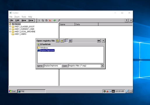 In the module click on Start>Programs>ColibriTools>RegEdit after that File>Import Registry… in the window that opens select the .reg file that you copied in the last step. (See image bellow)